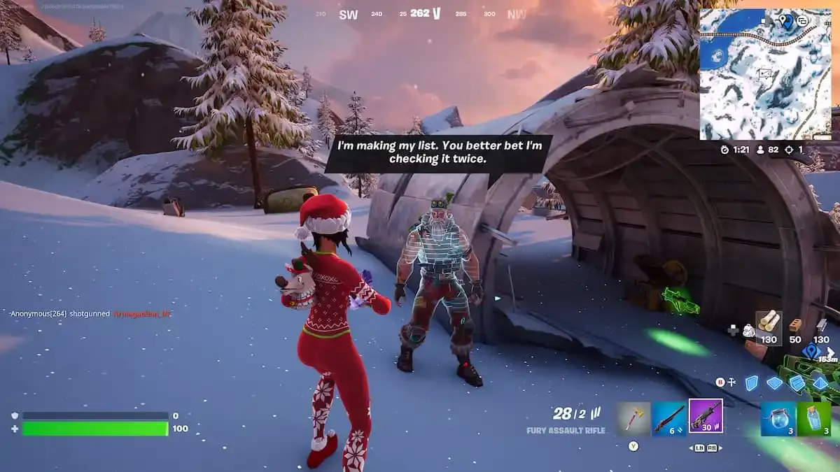 La Wintervestigación en Fortnite ya está en marcha, y durante la próxima semana, descubrirás quién es el misterioso viajero en la cabaña de Crackshot. Completar cada misión de Wintervestigación te recompensa con 25K XP, lo que te ayudará a subir de nivel y desbloquear todo en el pase de batalla. Para comenzar estas misiones, ve y habla con el Sargento Winter en el sitio del accidente al sur de Foxy Floodgate.