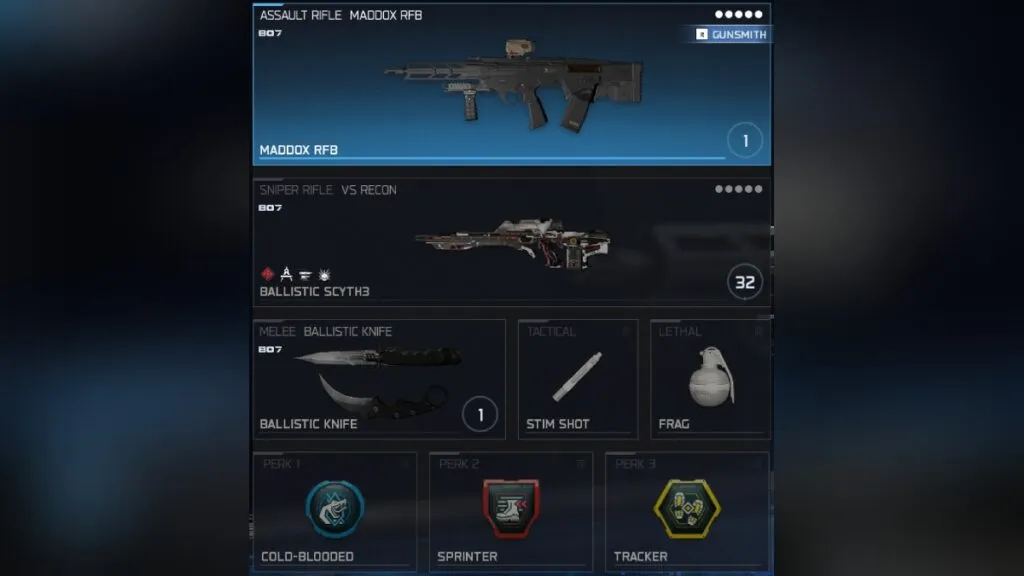 En el slot de arma secundaria podís llevar lo que querai. Las SMG y los snipers son las mejores opciones, pero en lo personal prefiero tener un sniper, así que la VS Recon es mi secundaria de confianza. Elige el arma cuerpo a cuerpo que más te acomode.
