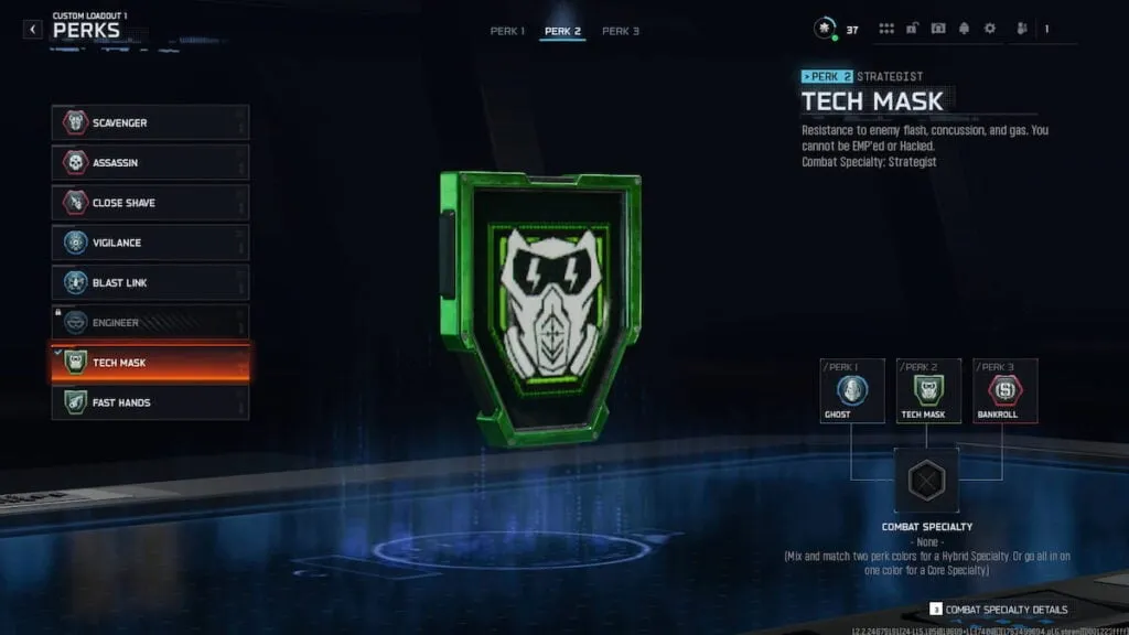 - Tech Mask (Perk 2): Resistencia a flashes, conmociones y gas enemigos. No te pueden hacer EMP ni hackear.