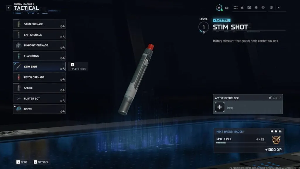 | Stim Shot | Nivel 21 | Estimulante militar que cura rápidamente las heridas de combate. | Nivel dos: Permite limpiar debuffs del jugador. Nivel tres: Agrega un buff de velocidad de movimiento. |