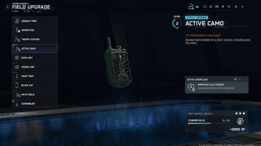| Active Camo | Nivel 52 | Te vuelves casi invisible por un corto periodo. Atacar termina el efecto. | Nivel dos: Mayor duración y tiempo de carga más rápido. Nivel tres: Los disparos solo te revelan temporalmente en lugar de terminar la habilidad. |