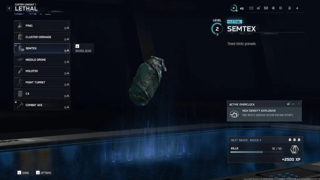 | Semtex | Nivel 12 | Granada adhesiva con temporizador. | Nivel dos: Material explosivo de alta densidad mejora la letalidad. Nivel tres: Agrega la opción de cocinar la mecha. |