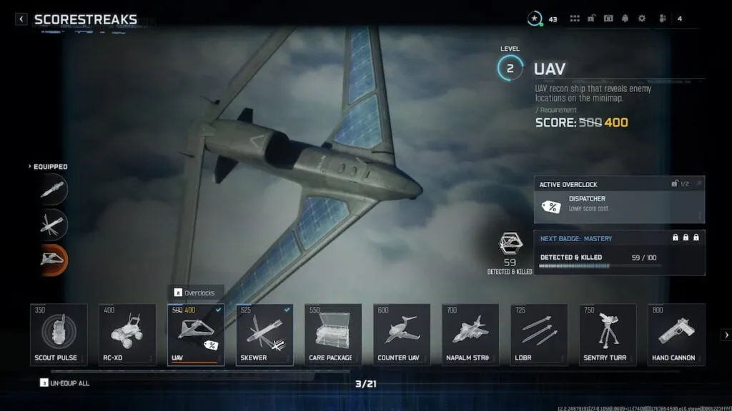 | Scorestreak | Requisito de desbloqueo | Costo de score | Descripción | Overclocks |