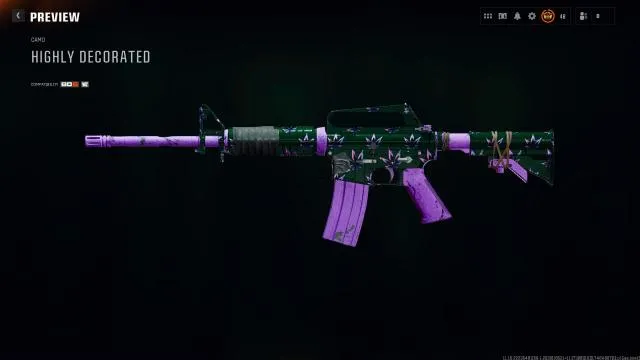 Para desbloquear el camuflaje animado Highly Decorated, primero debes conseguir las 10 recompensas estándar, lo que suma un total de 255 Blaze Bucks. Una vez que las tengas todas, el camuflaje se desbloquea automáticamente y puedes equiparlo de inmediato en tus armas favoritas. Este camuflaje tiene una base púrpura elegante con hojas animadas que se mueven. Si tienes el Pase de Batalla BlackCell, también recibirás una variante exclusiva con un diseño dorado llamativo.
