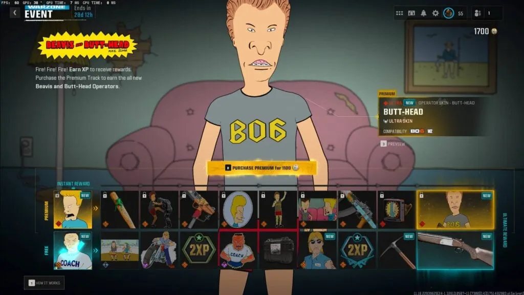 Tal como en eventos anteriores, el pase del Evento de Beavis y Butt-Head tiene dos rutas: Gratis y Premium, cada una con 10 recompensas únicas. Si quieres desbloquear las 20, tendrás que comprar la Ruta Premium por 1,100 puntos CoD.