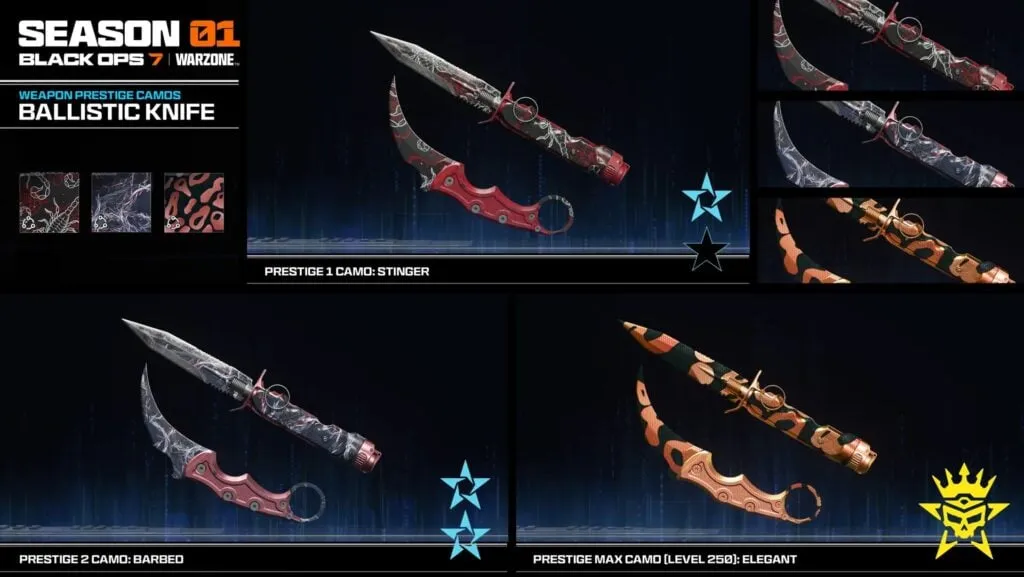 El Cuchillo Balístico no tiene accesorios, pero igual lo puedes subir hasta nivel 30 y entrar al Prestigio de Arma para desbloquear camuflajes de Prestigio universales para armas cuerpo a cuerpo. Esto es lo que puedes conseguir: