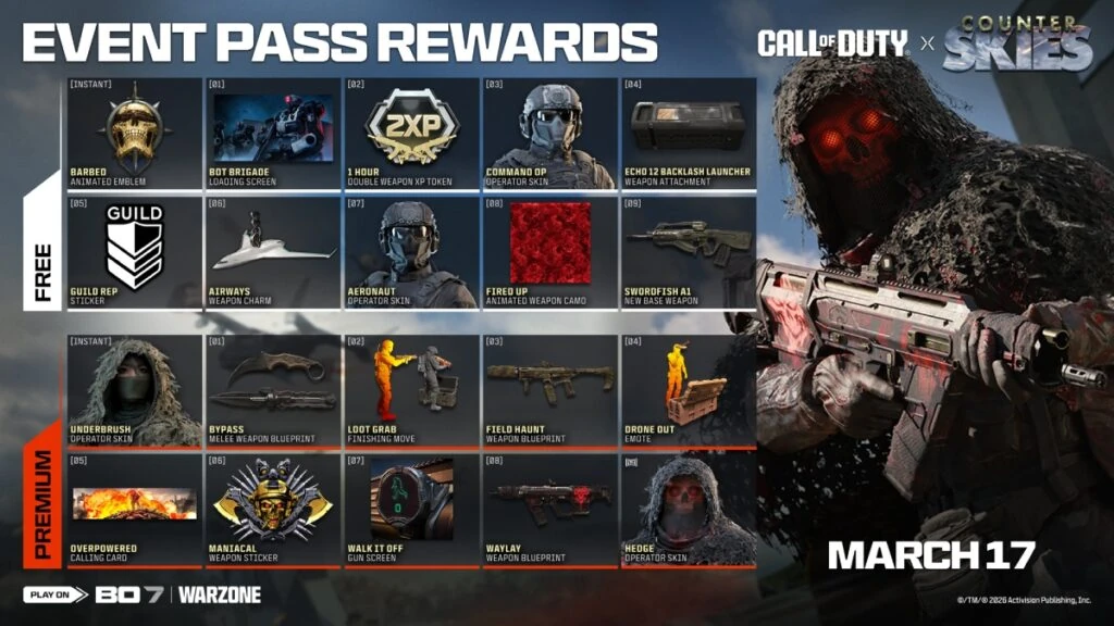 El progreso se comparte entre todos los modos de juego, ya que el evento está activo en los cuatro modos. En Warzone, no existe un requisito de desbloqueo aparte. Vas ganando XP del evento jugando partidas de BR, consiguiendo bajas, completando contratos y sobreviviendo más tiempo, y todo eso alimenta la barra de progreso de Counter Skies.