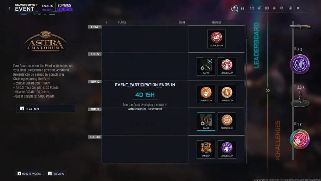 Similar al Proving Grounds de BO7 en multijugador de la semana pasada, el evento Astra Malorum gira en torno al progreso en la tabla de posiciones. Te van a meter en un grupo chico de jugadores y vas a pelear por quedar lo más arriba posible para ganar mejores recompensas. Aun así, aunque no quedís en la parte alta del ranking, hay un set de desafíos del evento con desbloqueos asegurados, así que todos se llevan algo.