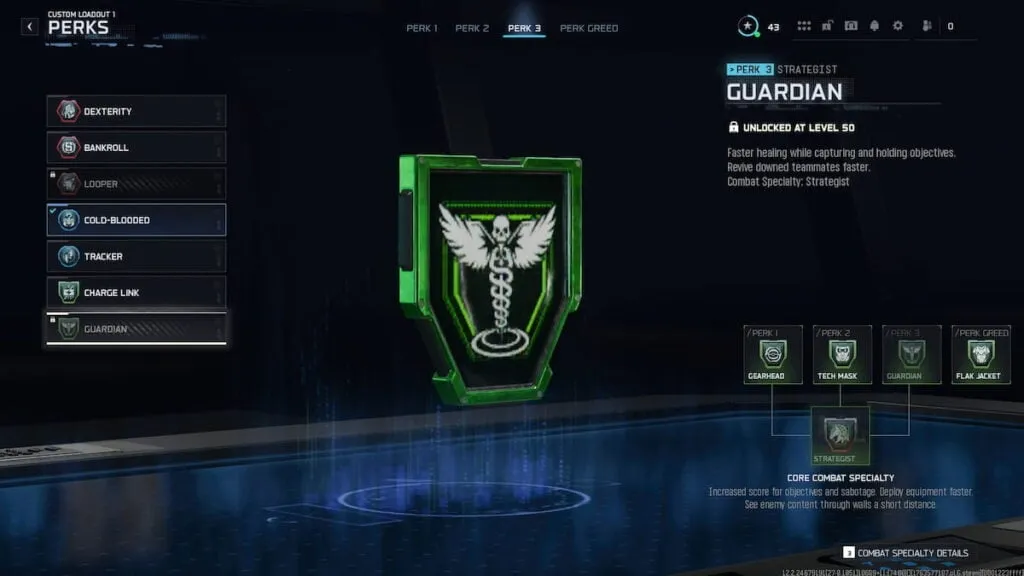 El último de la lista es Guardian, que mejora tu curación mientras estai en la zona y te permite usar otro táctico que no sea Stim Shot. Los cuatro perks juntos activan la Strategist Combat Specialty, que aumenta tu puntaje por jugar el objetivo y sabotear, y además te deja desplegar el equipo más rápido.