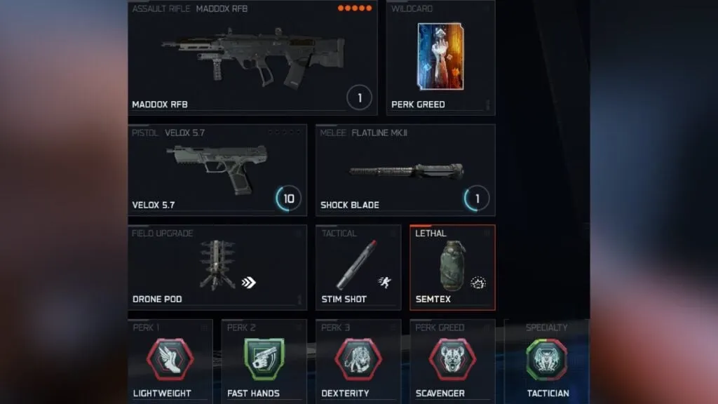 El clásico combo de Semtex con Stim sigue siendo de lo mejor para el multi. Pasando a las Ventajas, ocupa Lightweight para aumentar tu velocidad al correr y recuperar más rápido después de deslizarte o saltar, manteniéndote fluido en los tiroteos más frenéticos. Fast Hands acelera las recargas y cambios de arma, así nunca perdís un duelo por quedarte pegado recargando.