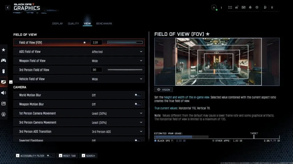Algunos ajustes gráficos pueden ayudarte a tener una puntería más precisa con el control. En la pestaña de Vista dentro de Gráficos, te recomendamos lo siguiente: