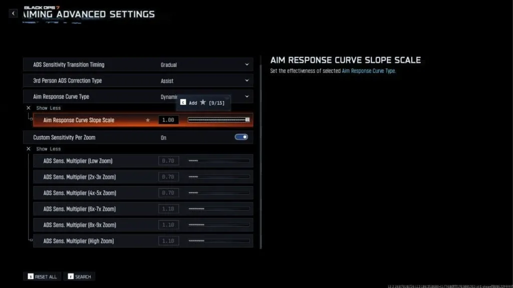 Mantén la transición ADS en Gradual para que el paso entre disparo libre y apuntado se sienta natural. La curva dinámica es la más fluida y ayuda a controlar la puntería con más precisión. La asistencia de puntería debería estar siempre activa si jugás con mando.