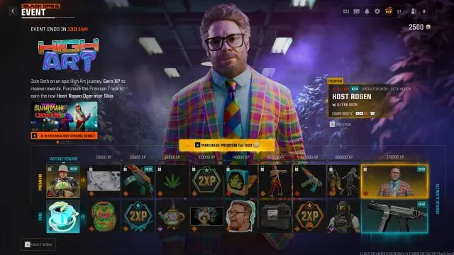 El pase del evento High Art trae 20 recompensas, divididas entre una Ruta Gratuita y una Ruta Premium. Si querís ir con todo, la Ruta Premium cuesta 1.100 puntos CoD e incluye al operador Seth Rogen y dos skins exclusivos para él.