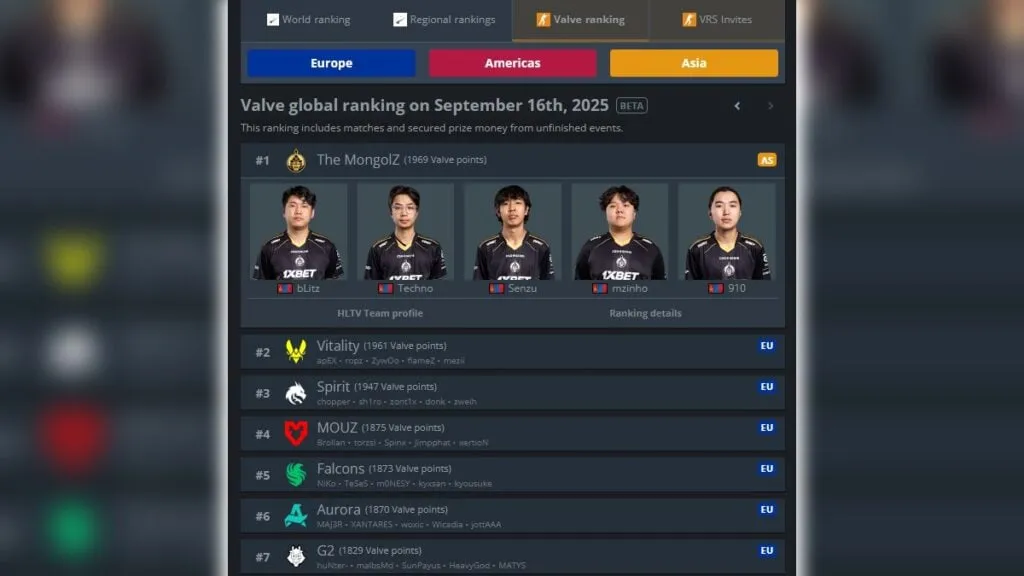 Al momento de escribir esta nota, The MongolZ suman 1.969 puntos VRS, superando a los campeones del Austin Major, Team Vitality, y a los ganadores del Shanghai Major, Team Spirit, que están en el segundo y tercer lugar con 1.961 y 1.947 puntos, respectivamente.