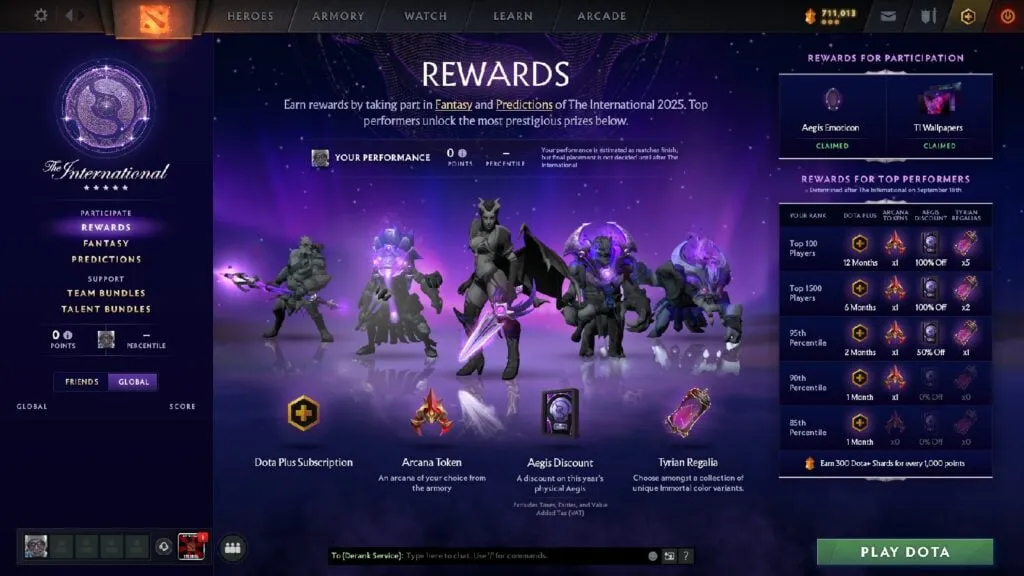 | 95 percentil | 2 meses de Dota Plus, 1 Arcana Token, 50% de descuento en Aegis y 1 Tyrian Regalia |