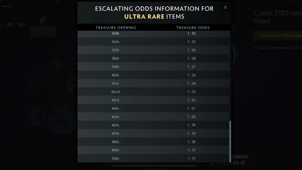 El sistema de probabilidades crecientes de Valve está hecho para que con el tiempo vayan mejorando tus chances de conseguir ítems raros, pero al inicio las probabilidades son casi imposibles. El primer cofre ofrece una chance de 1 en 100.000 de obtener el arcano de Earthshaker en Dota 2.