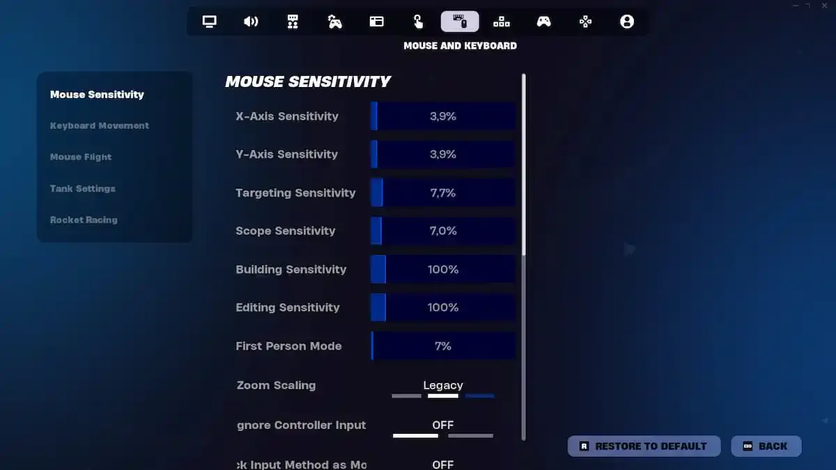 Como Fortnite normalmente se juega en tercera persona, ajustar las sensibilidades de los ejes X e Y podría no ser suficiente, por lo que también deberías cambiar el valor del modo en primera persona. No hay un número exacto para convertir en este caso, pero después de algunas pruebas, recomendamos multiplicar el valor de tus sensibilidades de los ejes X e Y por tres, ya que están diseñadas para tercera persona.