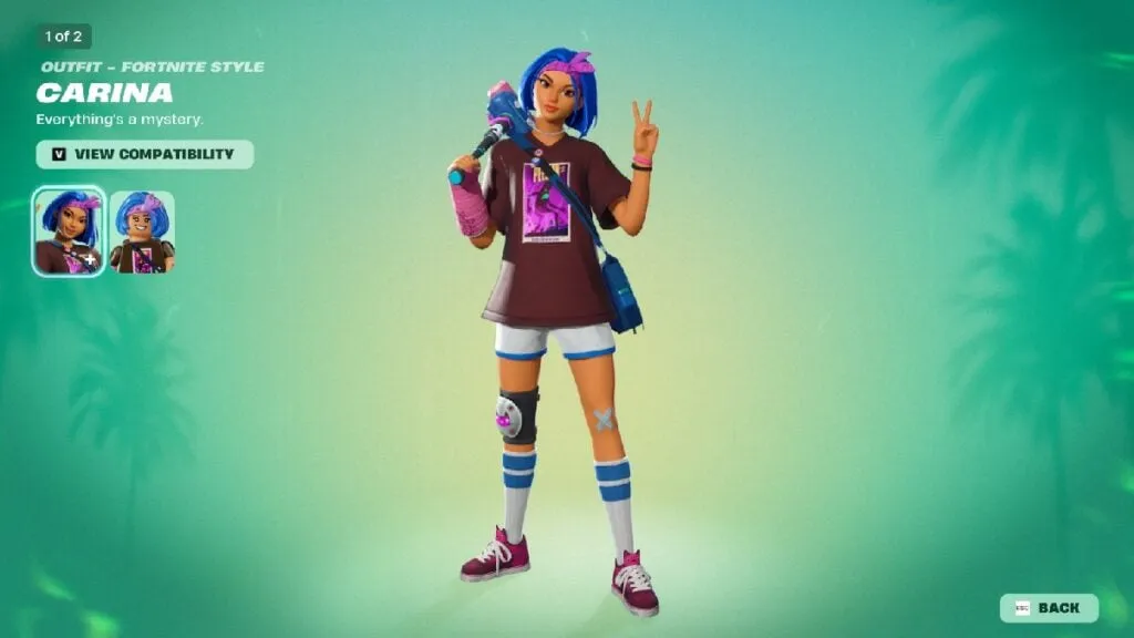 Carina es una skater y fan del parkour de pelo azul que ocupa una de las páginas tardías del Battle Pass. Su set incluye cosméticos ligados a la exploración urbana, y al reclamar las recompensas de la página obtienes el outfit base de Carina.