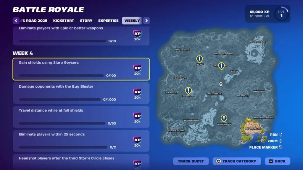 Con cuatro ubicaciones confirmadas en el mapa, saber exactamente dónde caer y cómo rotar para llegar fácil a estos géiseres puede marcar la diferencia entre irte eliminado al comienzo o asegurar un Victory Royale. Lo que los hace aún más importantes ahora es la misión de la semana cuatro, que te pide ganar 100 puntos de escudo con géiseres Slurp a cambio de 20.000 XP.