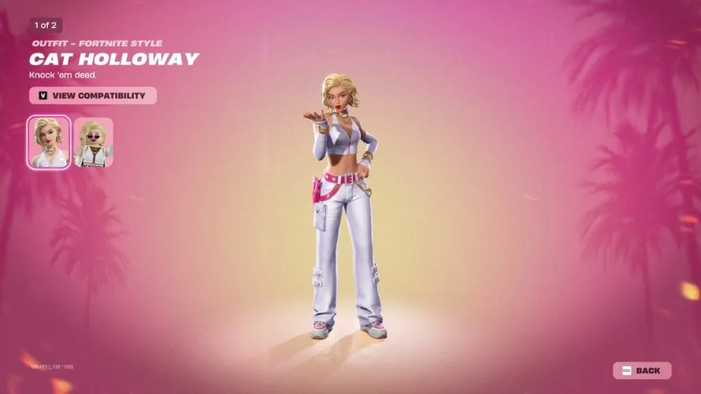 Cat Holloway es un atuendo de rareza Épica y representa una temática de Hollywood en la Golden Coast que marca gran parte de la identidad de esta temporada. Se presenta como una estrella de cine emergente, y su progresión visual refleja justamente esa historia. Sus primeros estilos la muestran como un talento en ascenso llegando a la alfombra roja, mientras que los desbloqueos posteriores la convierten en una figura mediática mucho más pulida.