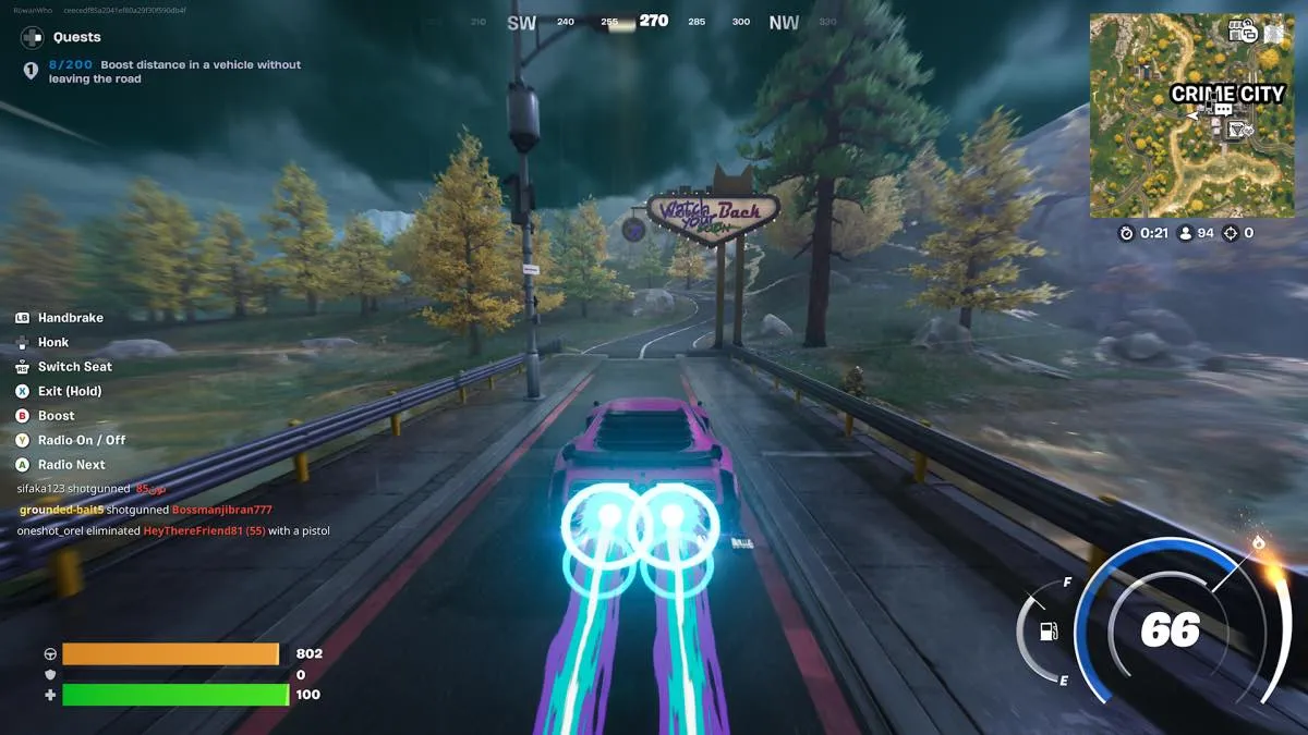 Este desafío es piola si encontrái una carretera larga de al menos 200 metros. Podís hacerlo en cualquier tramo, pero necesitái manejar bien. Nosotros caímos en Crime City, agarramos un auto y aceleramos por el camino que va al norte hacia Shiny Shafts. Quédate siempre en la carretera y haz los 200 metros de una.