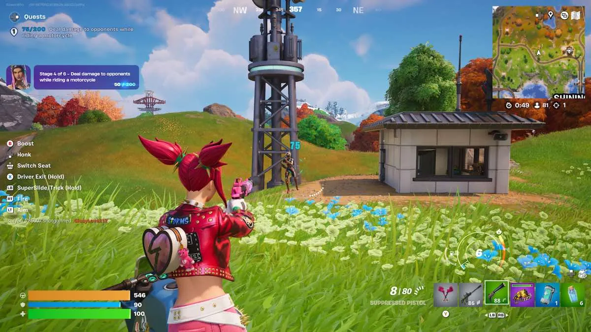 Busca una moto en un estacionamiento, bencinera o zona nombrada. Nosotros pillamos una en la estación Burd, al norte de Shiny Shafts. No siempre está, pero vale la pena mirar. Antes de subirte, consigue armas. Una pistola y un fusil de asalto te sirven perfecto. Anda rodando hasta encontrar enemigos y hazles daño sin bajarte. Necesitái hacer 200 de daño en total. También cuenta si atacas guardias, así que podís ir a una bóveda y hacerla ahí mismo.