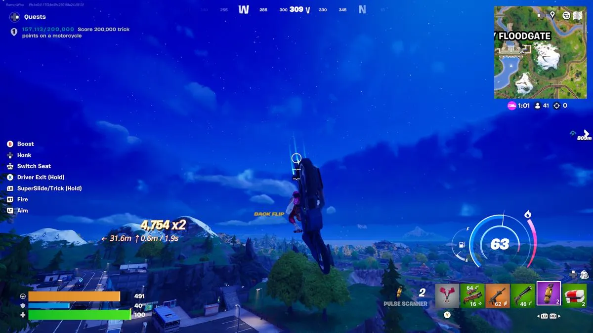 Una moto la podís encontrar fácil si caís en una bencinera o algún lugar con nombre. Nosotros casi siempre pillamos una en Foxy Floodgate. Fíjate en estacionamientos, afuera de casas o locales. Una vez que tengas la moto, acelera hasta la cima de un cerro y haz un backflip tirando el stick izquierdo hacia atrás. Aterriza bien pa’ que cuente el truco. Haciendo esto varias veces, llegái rapidito a los 200.000 puntos.