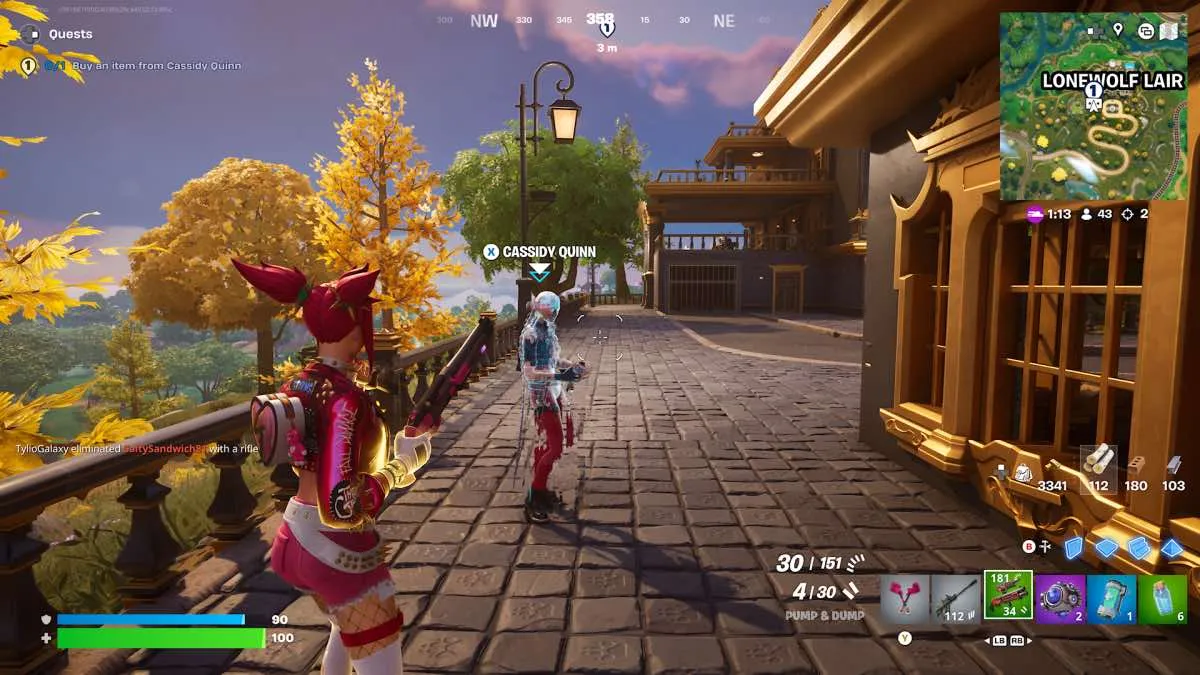 A Cassidy Quinn la encontrái en un edificio justo afuera de Lonewolf Lair. Si tenís oro, te puede vender Gold Splash o un Falcon Eye Sniper. Pero ojo, el Falcon Eye solo está disponible si ya completaste las misiones de dominio con rifle de francotirador.