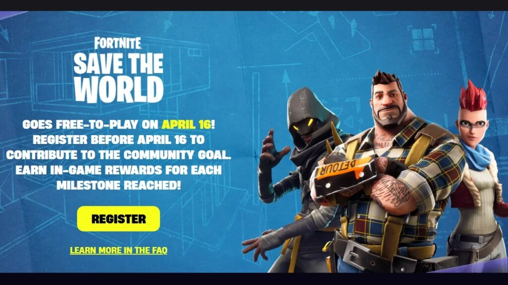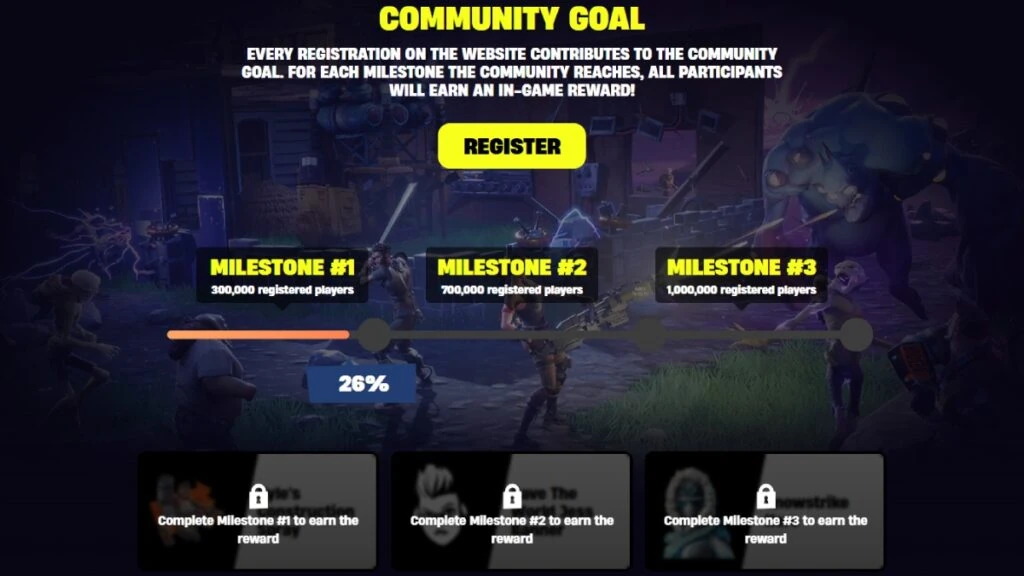 Epic abrió una campaña de pre-registro por tiempo limitado antes de que Fortnite Save the World pase a ser completamente free-to-play. Al registrar tu cuenta de Epic en la página oficial de Save the World, ayudas a empujar hitos globales de la comunidad que desbloquean recompensas cosméticas para todas las personas que se hayan inscrito.