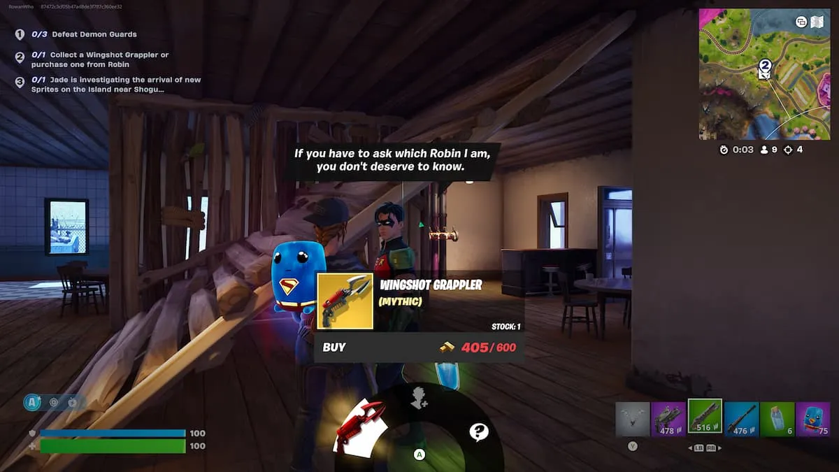 Ve a encontrarte con Robin en la Sala de Slurp, cerca de los campos arcoíris. Cómprale un Wingshot Grappler por 600 lingotes de oro. Usa el Wingshot para desplazarte 500 metros y luego inflige 100 de daño dentro de los 10 segundos después de aterrizar usando el gancho. Así completarás sus misiones.