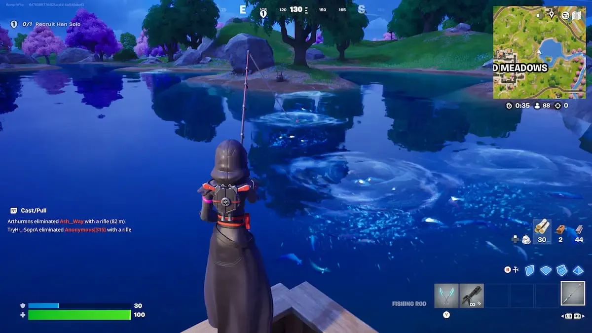 Inicia la misión hablando con Jar Jar y seleccionando el ícono de misión. Tu primera tarea es pescar un pez en cualquier punto de pesca. El mejor lugar que encontramos para esto es la laguna cerca de Masked Meadows. Ahí encontrarás varios puntos de pesca, una cabaña y un barril con cañas de pescar. Interactúa con el barril para obtener tu caña, lanza la línea en un punto con ondas y atrapa un pez. Recógelo para completar esta etapa.
