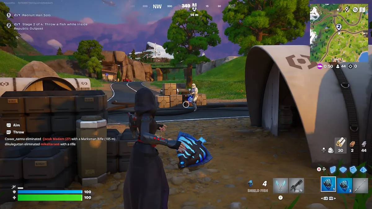 En la siguiente etapa, tienes que lanzar el pez que acabas de pescar dentro de un Puesto de la República. Los puestos más cercanos están en los caminos alrededor de Masked Meadows, Seaport City y los campos arcoíris. Para lanzar el pez, equípalo y mantén presionado el botón de apuntar (gatillo izquierdo), luego lánzalo con el botón de disparo (gatillo derecho).