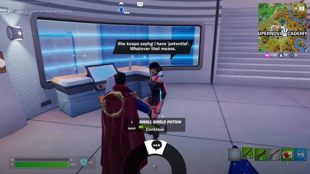 Una vez que las sombras estén sincronizadas, dirígete a la bóveda secreta al norte del punto de interés de la Academia Supernova. Baja las escaleras y encontrarás al NPC Morgan Myst. Habla con ella, completa los diálogos y avanza al siguiente desafío.