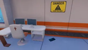 Avanza hacia el sur hasta ver un cartel que dice “Peligro Alta Tensión”, y recoge otra pieza justo debajo del cartel. Finalmente, en el centro de la sala, junto a la planta de fabricación, encontrarás un trípode al lado de una silla. Junta las tres partes para pasar al siguiente objetivo.