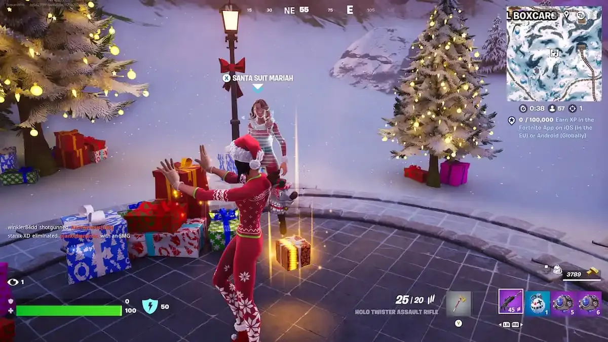 Las celebraciones de Winterfest en Fortnite comenzaron con un mini-evento de Mariah Carey en las montañas nevadas cerca de la cabaña de Crackshot. Allí, Mariah salió de un bloque de hielo, interpretó su icónica canción festiva, *All I Want For Christmas Is You*, y lanzó a los jugadores por los aires antes de desaparecer. Ahora, Mariah está de regreso como NPC y está regalando regalos navideños gratis.