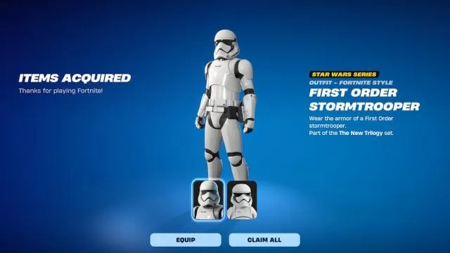 Una vez que las cuentas estén vinculadas, abre Fortnite desde la Epic Games Store. Cuando cargue el juego, te va a salir una pantalla donde podís reclamar el outfit del Stormtrooper de la Primera Orden. Este incluye un estilo especial para el LEGO Fortnite.