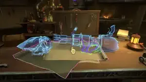 Para comenzar el mini-juego, encuentra el banco de trabajo de Ekko en el centro de la habitación, donde también hay una foto de la infancia de Ekko con Benzo. Una vez allí, simplemente haz clic en el arma Rhino, y necesitarás encontrar la mega fuente de energía para darle vida al arma.