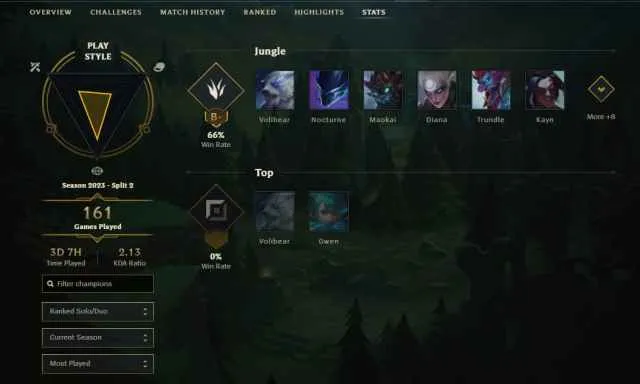 Las estadísticas en el cliente de League incluyen partidas jugadas y cuánto duraron. Solo muestra datos de esta temporada, pero puedes revisar tu historial desde el 2022.