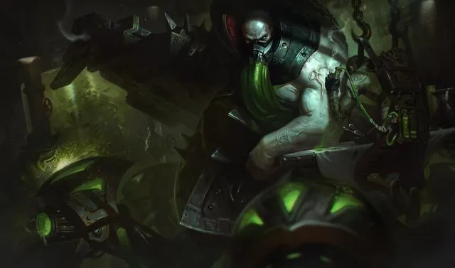 Este campeón es una verdadera pesadilla, y bien podría aparecer en una peli de miedo. Es mitad humano, mitad máquina, y lleva puesta una máscara de gas que da susto. No es alguien con quien te quieras cruzar.