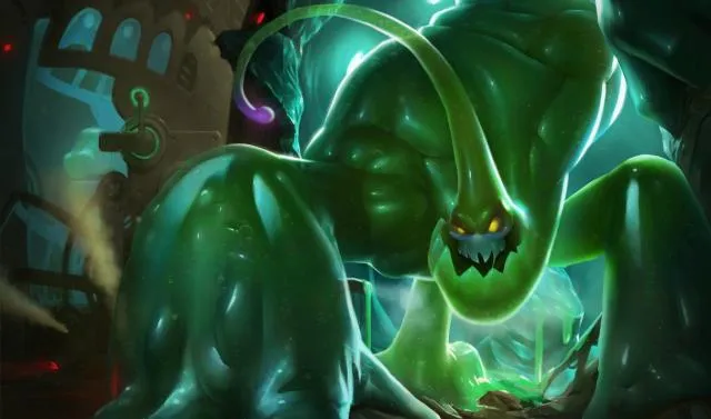 Este campeón es de un verde intenso —es probablemente la mejor forma de describirlo. Es una masa pegajosa, tóxica y elástica que rebota por el mapa como una especie de trampolín viviente. Yo no querría toparme con él en un callejón oscuro, la verdad.