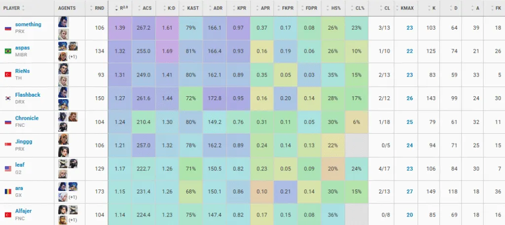 Según vlr.gg, el duelista estrella de 22 años fue el segundo jugador mejor calificado con 1.32 en la fase de grupos de VALORANT Champions 2025—solo detrás de something de Paper Rex, que se quedó con el primer lugar con 1.39. Su logro se explica por la cantidad de rondas multi-kill y eliminaciones decisivas que entregó jugando para Made in Brazil (MIBR) contra equipos como FNATIC, Billibilli Gaming y Rex Regum Qeon. Además, está dentro de los cuatro mejores jugadores en Average Combat Score (255, cuarto lugar) y Kills Per Round (0.93, tercero).