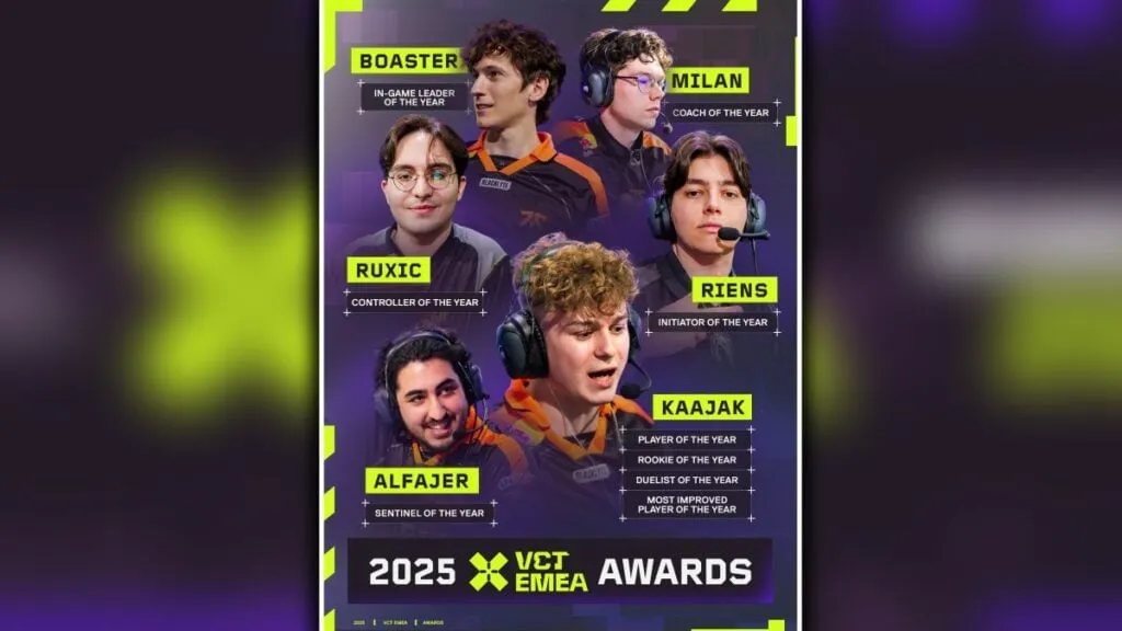 Fnatic se adueñó de la noche (y del año): Kaajak, en su primer año completo como pro, barrió con cuatro premios, incluyendo Duelist, Rookie, Most Improved y Player of the Year.