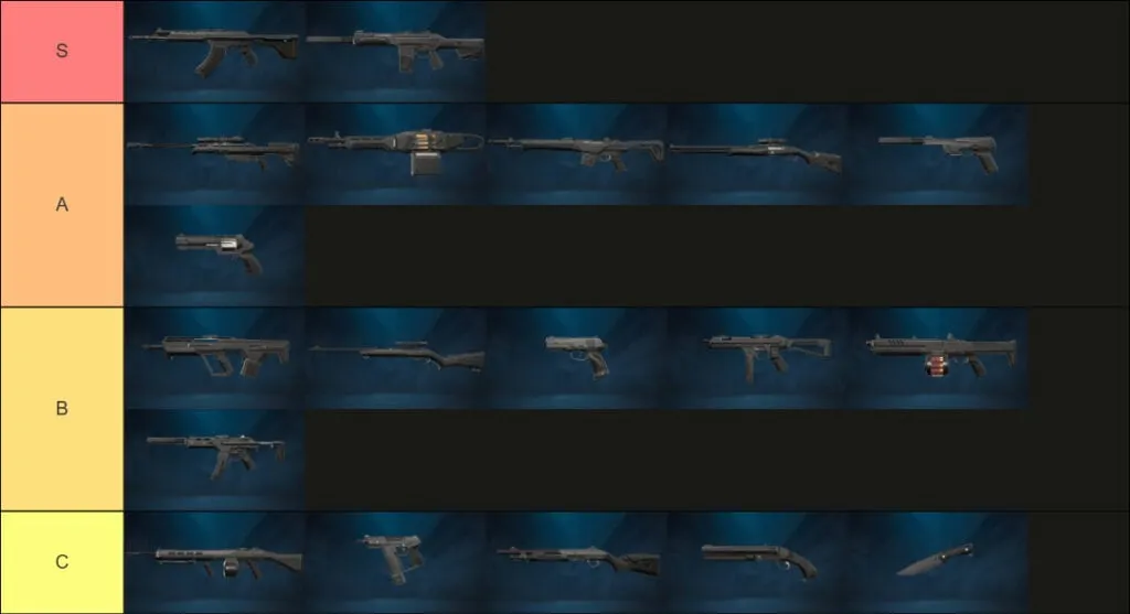 | B-Tier | Bulldog, Marshal, Classic, Stinger, Judge, Spectre |