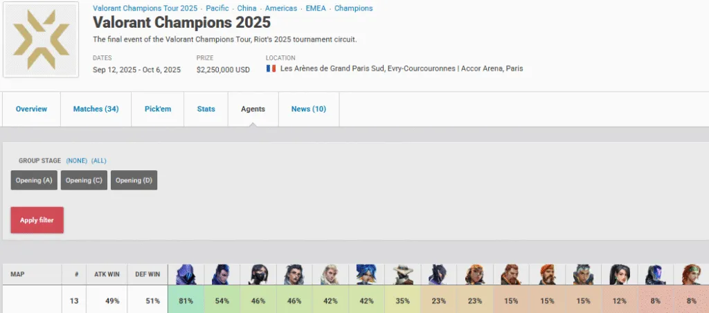 En los 13 mapas y seis series de grupos jugados en Champions 2025 hasta ahora, Jett fue elegida solo una vez—por Team Liquid en Abyss. Ni siquiera en la Etapa Dos estuvo tan mal. Raze también ha visto dañado su prestigio, considerando que antes era una de las duelistas más populares junto a Jett. Aun así, mantiene una tasa de selección decente del 23%.