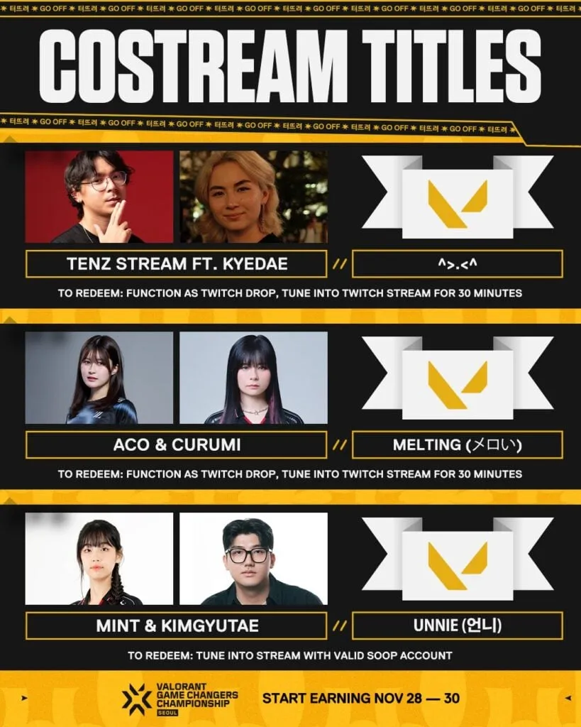 Dos títulos exclusivos adicionales estarán disponibles durante el VCT Game Changers Championship 2025 a través de costreams en Twitch: “Melting” se puede conseguir viendo el costream de Aco y Curumi por 30 minutos, mientras que “>.<” se obtiene viendo el costream de Tenz y Kyedae por 30 minutos. Ambos títulos de Twitch requieren vincular tu cuenta de Riot a Twitch y ver los streams durante la ventana del campeonato del 28 al 30 de noviembre.