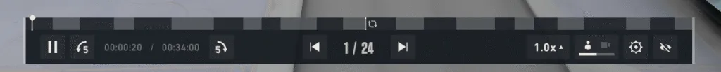 Cuando descarguís una repetición en VALORANT, haz clic en el botón de play para verla. Ahí podís repasar toda la partida con una barra horizontal de HUD para controlar la experiencia.